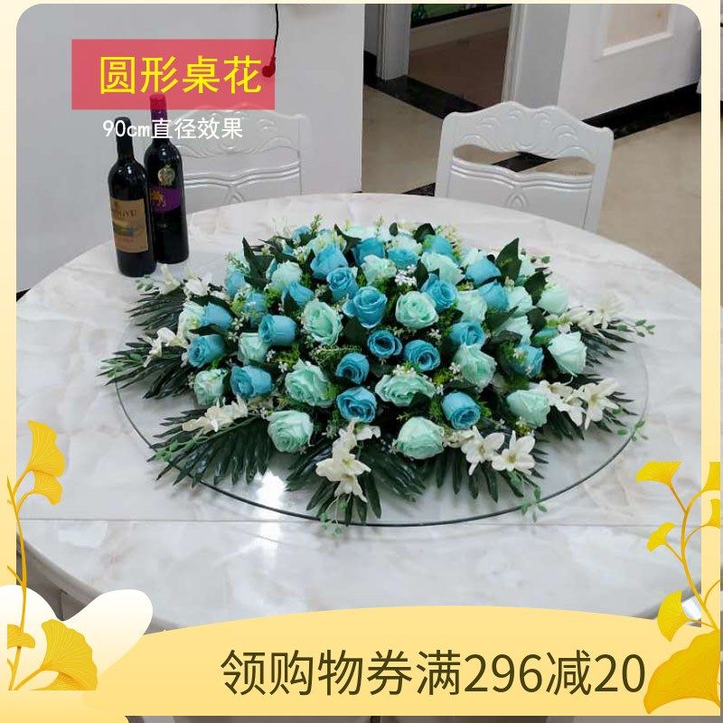 圆形大桌蓝色桌花酒店电动转盘装饰仿真花餐桌摆放绢花塑料假花艺热门设计联盟服务商