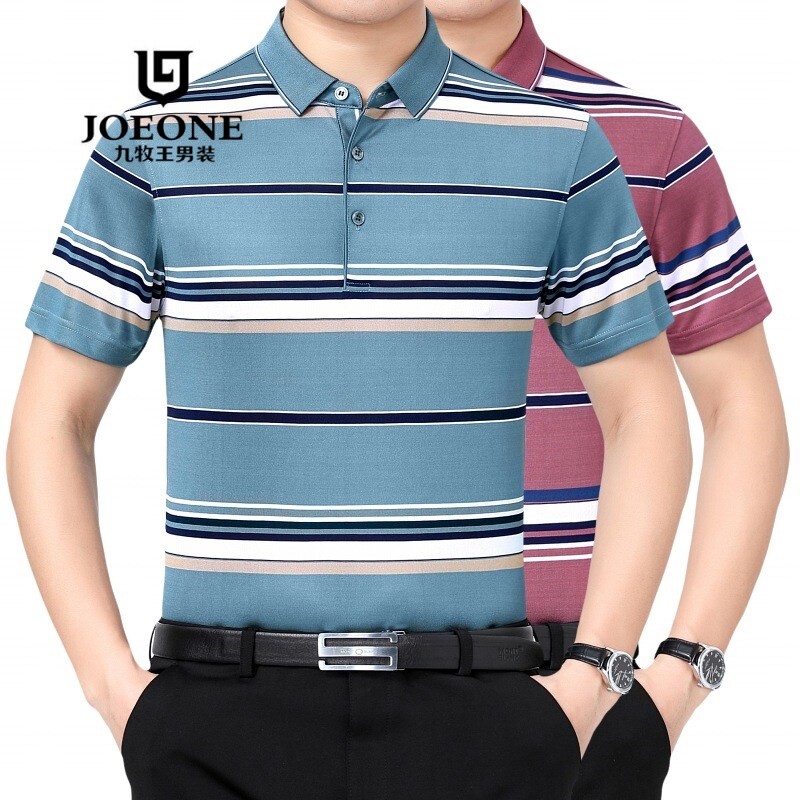九牧王正品夏季翻领条纹桑蚕丝短袖中青年冰丝半袖商务休闲男装po热门设计联盟服务商