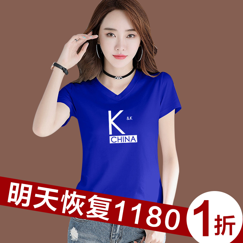 动感 哥弟纯棉短袖t恤女V领夏款ins潮桃子领半袖修身印花上衣服热门设计联盟服务商